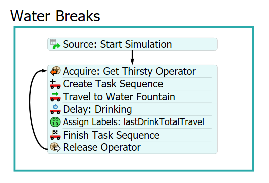 Now that your basic transportation task sequence is set up, you'll create a series of tasks that will occasionally pull the operator away from their normal transportation tasks and send them to get a drink of water. You'll want to simulate the operator getting a drink from the drinking fountain after the operator has traveled more than 100 meters.