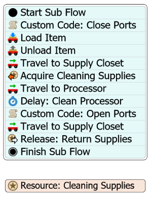 | Resource: Cleaning Supplies | This resource will represent the cleaning supplies that will be used to clean the processor. You'll set this resource so that it is globally accessible, which means that both operators (both instances) will use the same resource. Only one set of supplies will be available at a time. |
