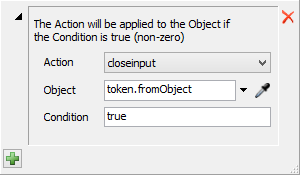 - Click the arrow next to the Object box to open a menu. Select token.labelName. In this box, change labelName to fromObject. This setting will make a dynamic reference to the object listed in the token's fromObject label. (This label assigns the current processor to this property. See Step 4 of Tutorial 1.1 as a reminder.) In other words, the incoming port from the current processor will be closed.