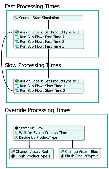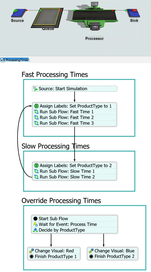 This concludes the Sub Flow tutorial. Hopefully you can see the many potential uses of sub flows to create simple but effective and customizable logic. For example, it would be easy to build off this basic sub flow to add more custom logic. You could see how you could add a task sequence sub flow in between the fast and slow items to simulate product changeover times.
