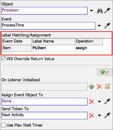 | Wait for Event: Process Time | This activity will still listen to the processor for the process time event. However, you'll also add a label named MyItem that contains a reference to the item that triggers this event. |