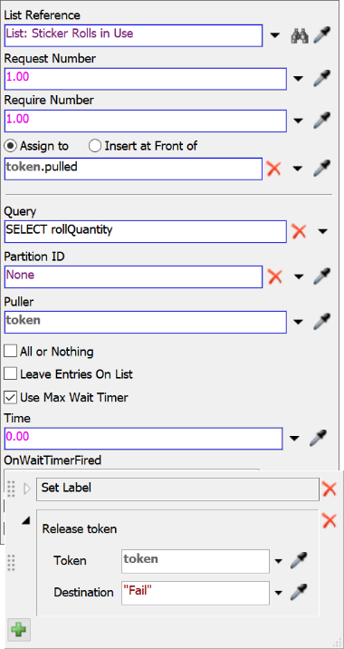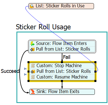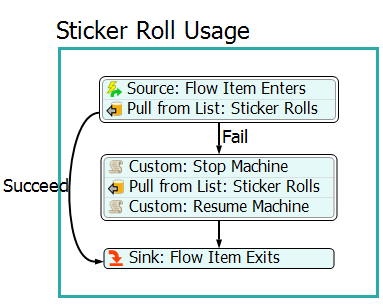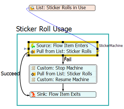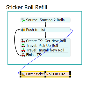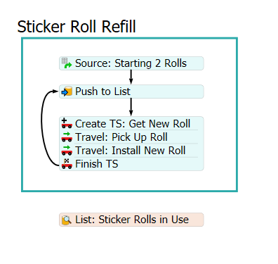 | Pull from List: Sticker Rolls | While the token is in this activity, it will continually attempt to pull from the List: Sticker Rolls in Use. If it fails, it will remain in this activity and try again. It will not succeed until the RollOperator installs a new roll on the sticker machine and the rollQuantity label returns to 20. After this token successfully pulls a sticker from the list, it will move to the next activity in the sequence. |