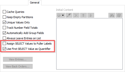 together. - In Properties of List: Sticker Rolls in Use, press Advanced to open that list's full properties window. Go to the General tab. Clear the Assign SELECT Values to Puller Labels checkbox, and check the Use First SELECT Value as Quantifier checkbox. Press OK to apply and close the properties window.