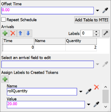 | Schedule Source: Starting 2 Rolls | When the simulation model begins, this activity creates tokens to represent the first two rolls of stickers on the sticker machine in the 3D model. When the Schedule Source creates these two tokens, it will add a label called rollQuantity that will represent the number of stickers that are on the sticker roll when it is first installed on the machine. The rollQuantity label will start with an initial value of 20 stickers. |