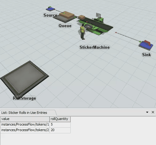 | List: Sticker Rolls in Use | Every time a flow item is processed by the sticker machine in the 3D model, the list will reduce the rollQuantity by 1. Keep in mind that when the rollQuantity reduces to 0, it will also simultaneously trigger the travel task sequences in the Roll Refill process flow. In other words, once the roll is empty, the RollOperator will travel to the RollStorage queue to pick up another roll. |