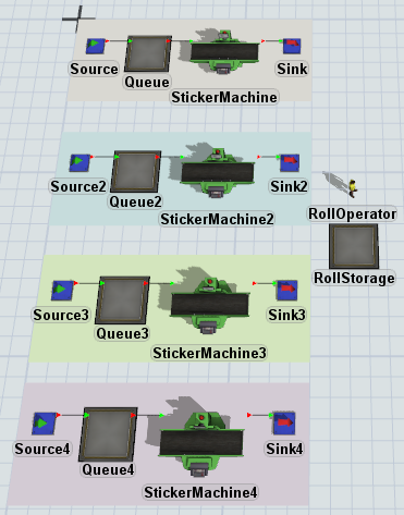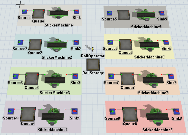 In this step, you'll create five more clones of the sticker system (for a total of 8). Since you won't need to update very many properties, you'll hopefully see how much easier it is to create these clones using process flow instances compared to the copy and paste method. You'll also move the RollStorage queue and RollOperator so that they are centered in between the eight sticker systems. When you are finished, your model should look similar to the following image: