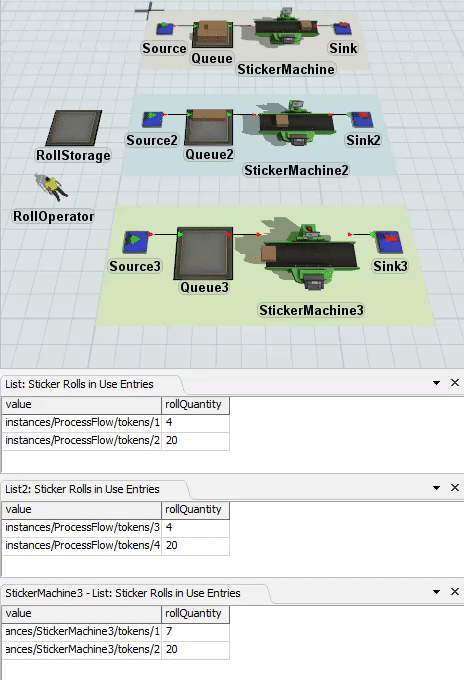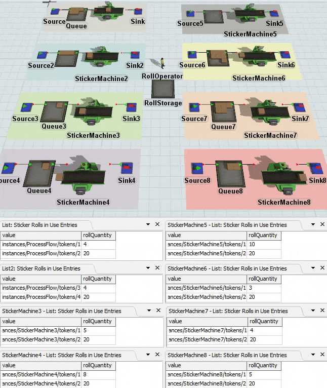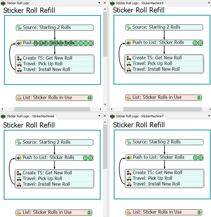 The following image shows a few different process flows while this simulation runs. In the top left corner, you can see the Sticker Roll Logic process flow, which is the main process flow that controls all other instances of the process flow. You can also see the specific instances of the process flows for Sticker Machines 5, 6, and 7.