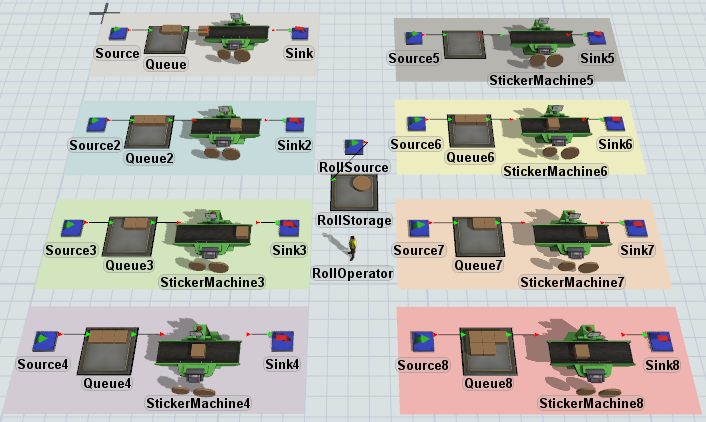 The plant you are trying to simulate needs 8 different sticker machines. This tutorial will teach you some best practices that will make the task of cloning sections of a model much easier. In particular, it will give you a deeper understanding of how process flow instances can help you simplify your models. Lastly, this tutorial will also demonstrate how easy it is to create this kind of complex logic in FlexSim using the Process Flow tool.