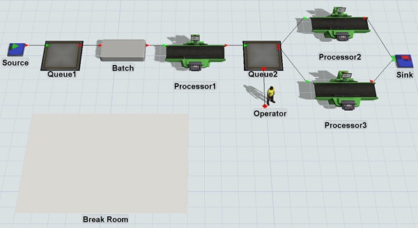 In this tutorial task, you'll learn how to use an object process flow to design the custom logic for a fixed resource. You'll add a BasicFR object to the model and attach it to an object process flow that will receive and process flow items in a batch. This tutorial will also cover common problems and pitfalls that come from designing custom fixed resources. When you're finished, your model will look similar to the following image: