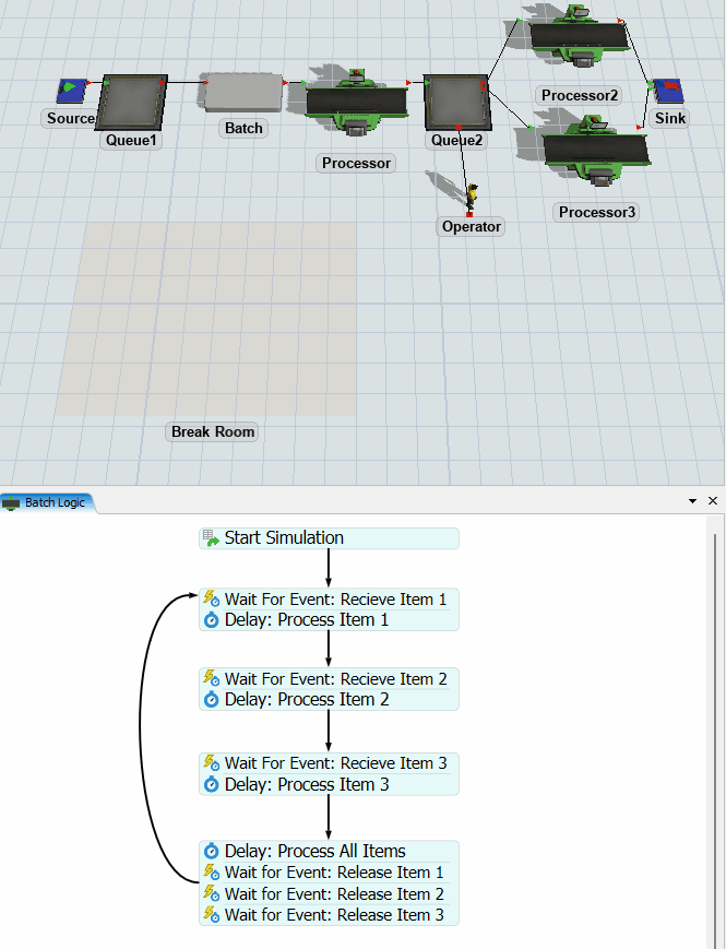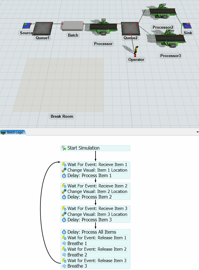 Second (and more importantly), you will notice that the Batch releases all three flow items at the same time and then jumps to the beginning of the next batch. Releasing the flow items simultaneously causes the processor to process three items at the same time, which is the wrong behavior. This behavior is caused by the way FlexSim's event handling works.