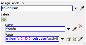 | Assign Labels: Weight | You'll add a label called Weight to the token that randomly assigns a weight to the box between 1 and 50. You'll use the uniform statistical distribution to assign this value. This distribution will mean that most of the time, a standard box (those with a weight below 40) will get created. But occasionally a large box (with a weight above 40) will get created. |