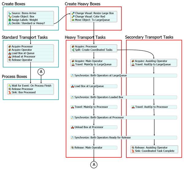 You'll model that kind of system in this tutorial. Normally, the two operators will transport standard size boxes on their own. But occasionally, a large box will require them to work together to transport the box, which means you'll need to design coordinated task logic to handle these special tasks.