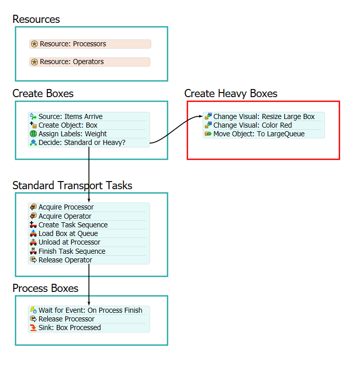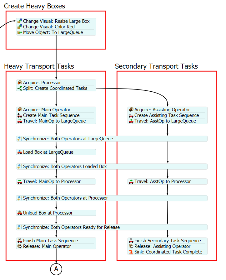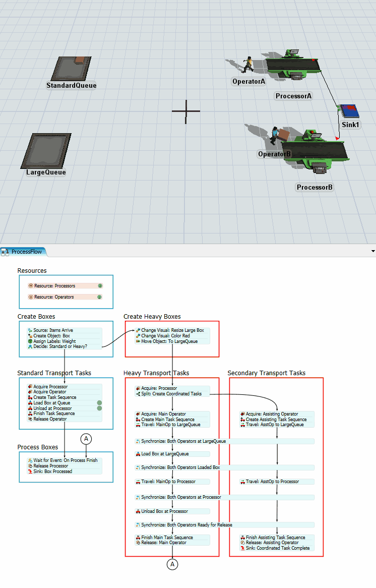 - From the Synchronize: Both Operators at LargeQueue activity to the Load Box at LargeQueue