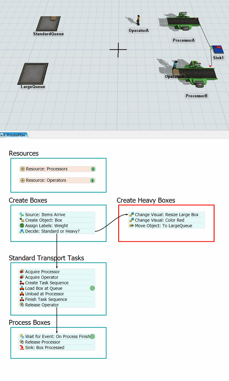 You'll begin by editing the process flow logic so that it occasionally creates a box that has a weight exceeding 40. When a box is larger than 40, you'll design logic that will change the box's visuals so that it appears larger than the standard boxes and is colored red. These changes will help make the heavy boxes visually distinct from the standard boxes. Then, you'll design logic that will place the heavy boxes inside the LargeQueue in the 3D model.