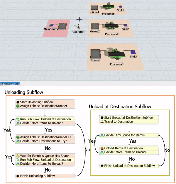 In this task, you'll design a system in which an operator transports several flow items at a time. In order to create this logic, you'll learn how to use sub flows in the Process Flow tool and you'll learn about labels that contain a special type of data called arrays.