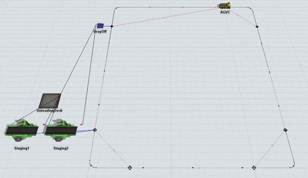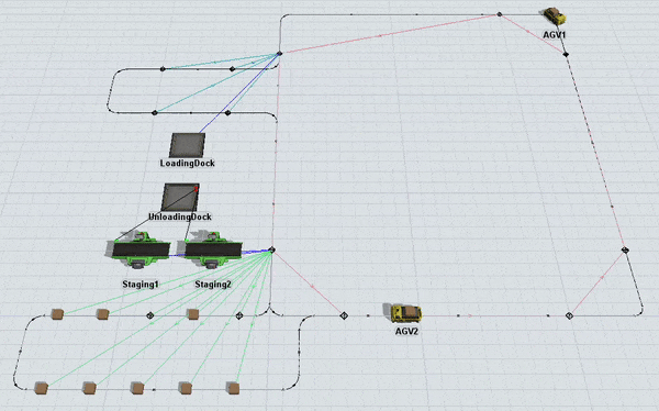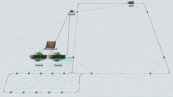 Notice that the first AGV drops off at DropOff4 and the second AGV drops off at DropOff3.