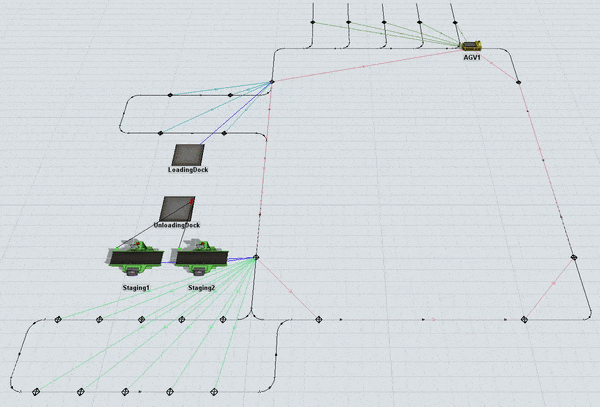 Notice now that the AGVs are more efficient as they travel through the system. The AGVs deadlocks less often and they quickly space themselves out efficiently throughout the network.