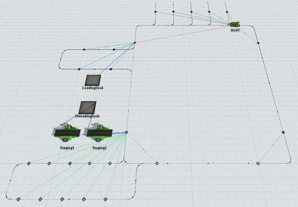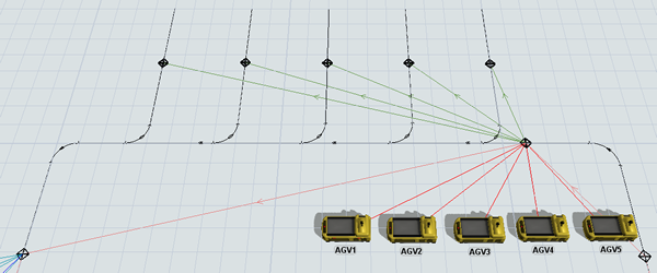 When the simulation starts, all five AGVs start in their designated park points and then travel throughout the network working on the transportation tasks. You'll notice that sometimes the AGVs have to stop momentarily. You'll learn how to reduce the amount of time an AGV waits at a control point in the next step.