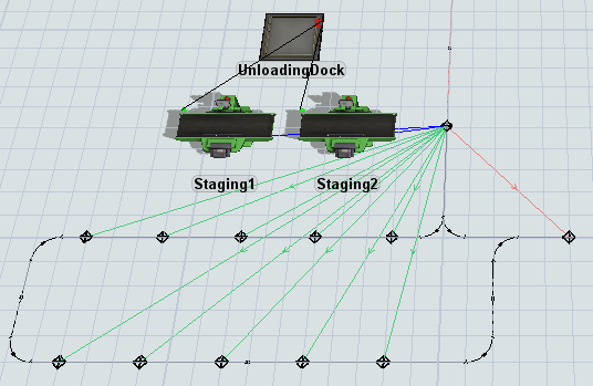In this step, you'll add three more AGVs to the model for a total of five. You'll also create park points for each of the AGVs. Park points are locations where AGVs begin when the simulation model first starts running. During a simulation run, an AGV can return to the park point to recharge its batteries when they are running low.