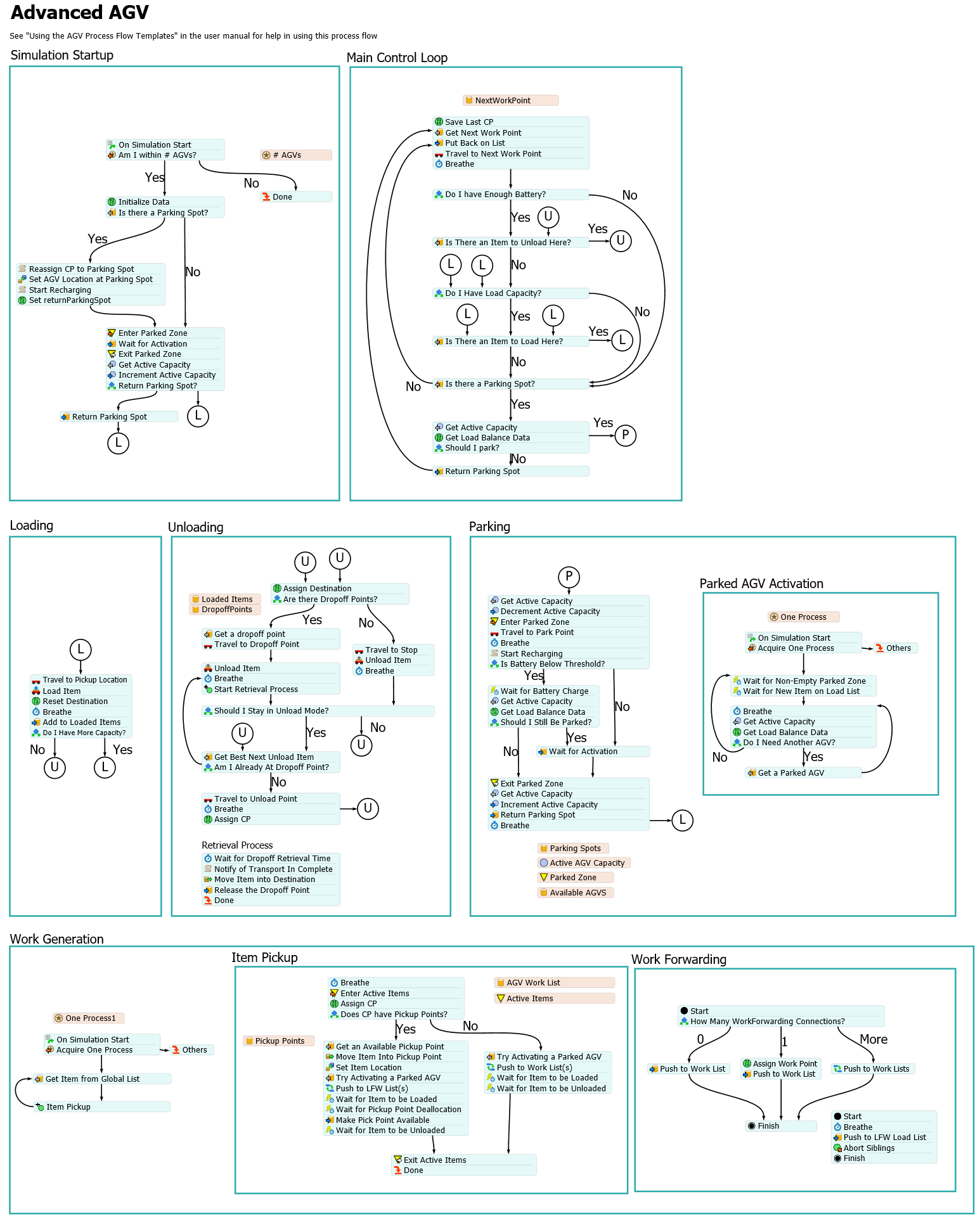 While it is beyond the scope of this tutorial to explain the exact details of how the AGV template works, you should be aware that this process flow will control nearly all of the logic in this AGV system. Consider exploring the AGV process flow template in more detail to learn how it works.