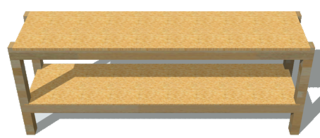 As an alternative to using polygons to create realistic effects, consider using textures instead. Textures are flat images (like a .png file) that can be added to the surface of a 3D object to give it the appearance of sophisticated textures and details. For example, this 3D workbench has simple polygons and uses a wood grain texture on its surfaces to give it a realistic appearance: