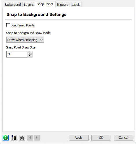 - In the Snap Points tab you can access the drawing's snap points in your FlexSim model. Using these settings, you can enable snap points and then determine whether you want the drawing's snap points to be visible in the model or not. The default option is to draw the snap points whenever you are dragging an object in the 3D model. See Working With Snap Points for more information.