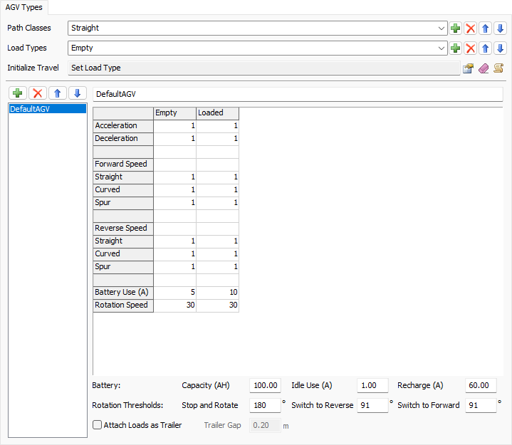 After you've set up the basic logic of your AGV network, you might want to make changes to the way AGVs behave. You can customize the speed at which AGVs travel, their load capacity, their battery life cycle, the amount of time they take to load and unload items, etc. This section will discuss the different properties you can control and where to adjust those settings.