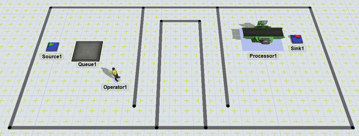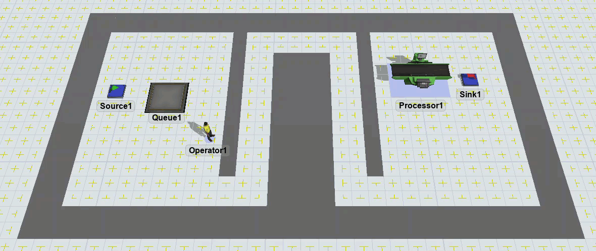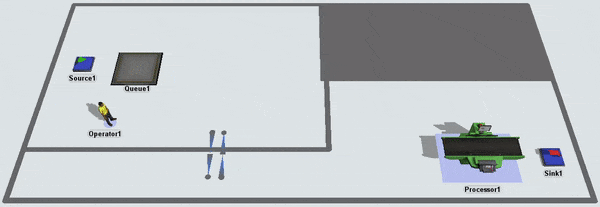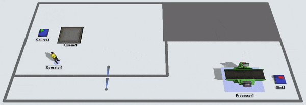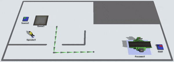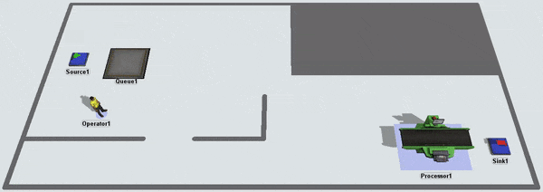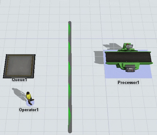 Notice that the task executer is considered as having arrived once it reaches the closest possible point to its destination. It unloads the item at the processor even though it is not very close to the processor. If you wanted the task executer to get closer to the processor, you could add a bridge: