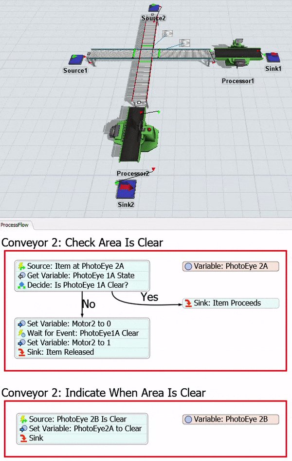 In this tutorial, you'll simulate PLC logic that will control a conveyor. The conveyor's logic will be entirely handled by the emulation shared assets in process flow. The conveyor logic in this model will be fairly simple: you'll start by designing a system that will delay a flow item on a conveyor for 5 seconds after it hits a photo eye: