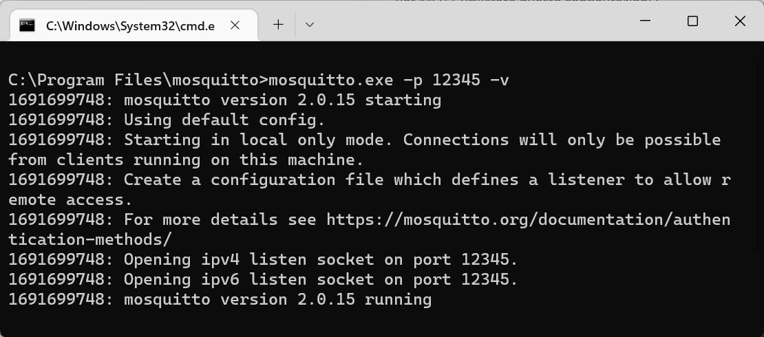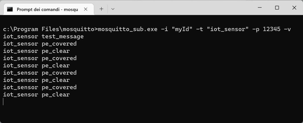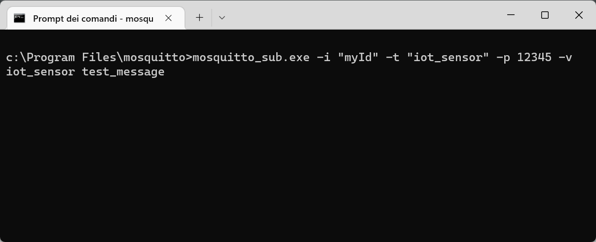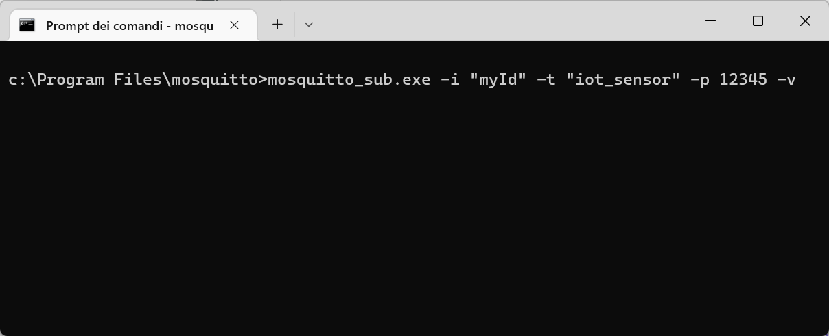 This command run the mosquitto broken on TCP port 12345 in a verbose mode. - Console 2 - client subscriber - run mosquitto_sub.exe -i "myId" -t "iot_sensor"