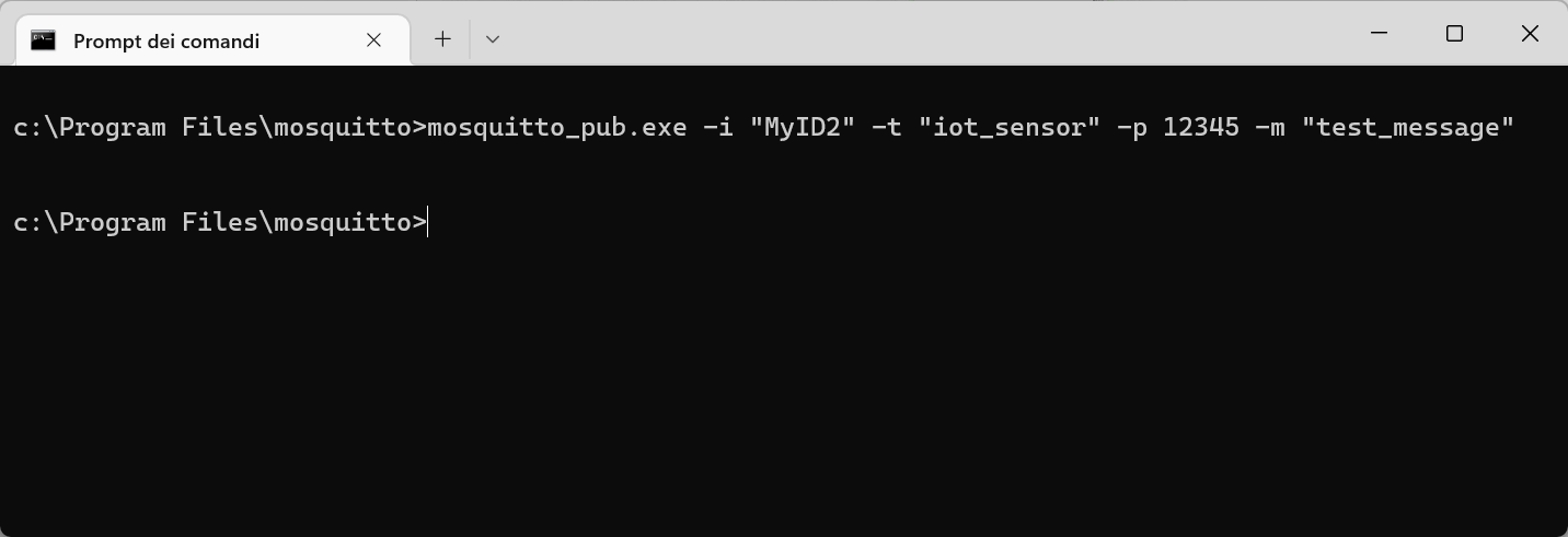 This command run a client with ID equal to 'MyID2' that publish the message 'test_message' on the topic 'iot_sensor'.