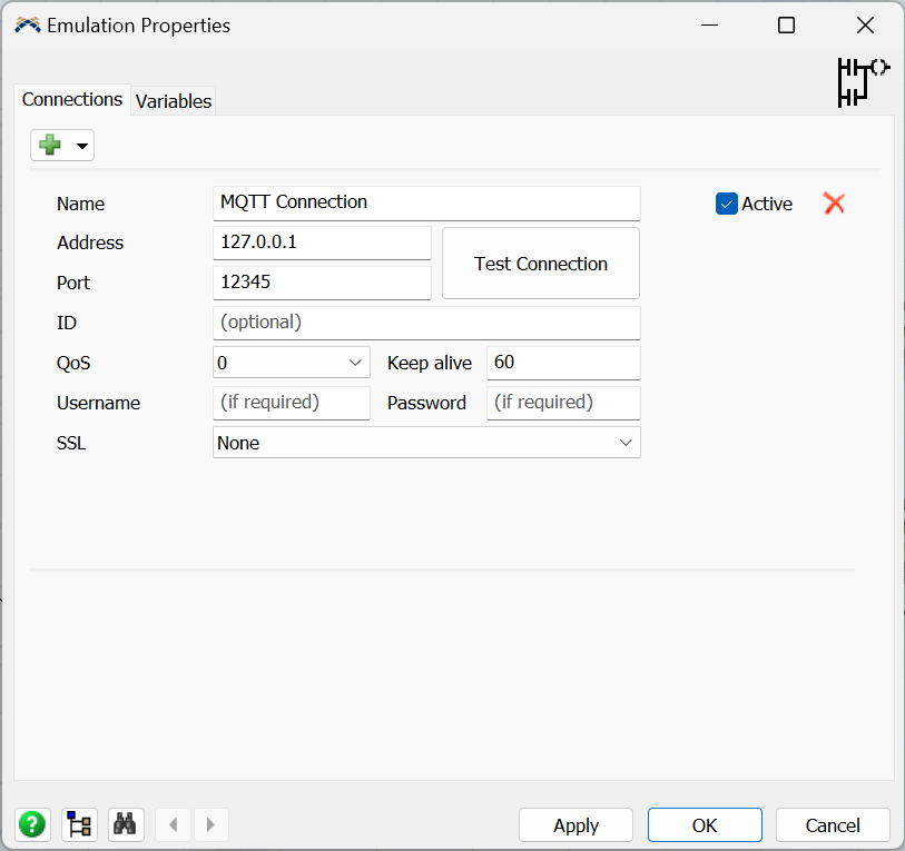 In the "Address" and "Port" enter the values of the MQTT broker: for this tutorial are 127.0.0.1 and 12345.