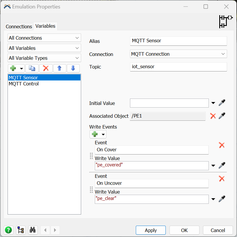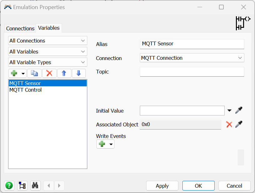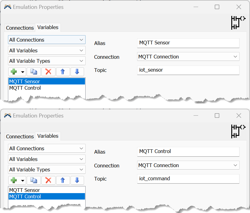 Click on the "Variables" tab and from the (+) sign add a MQTT Sensor (publisher) and a MQTT Control (subscriber)