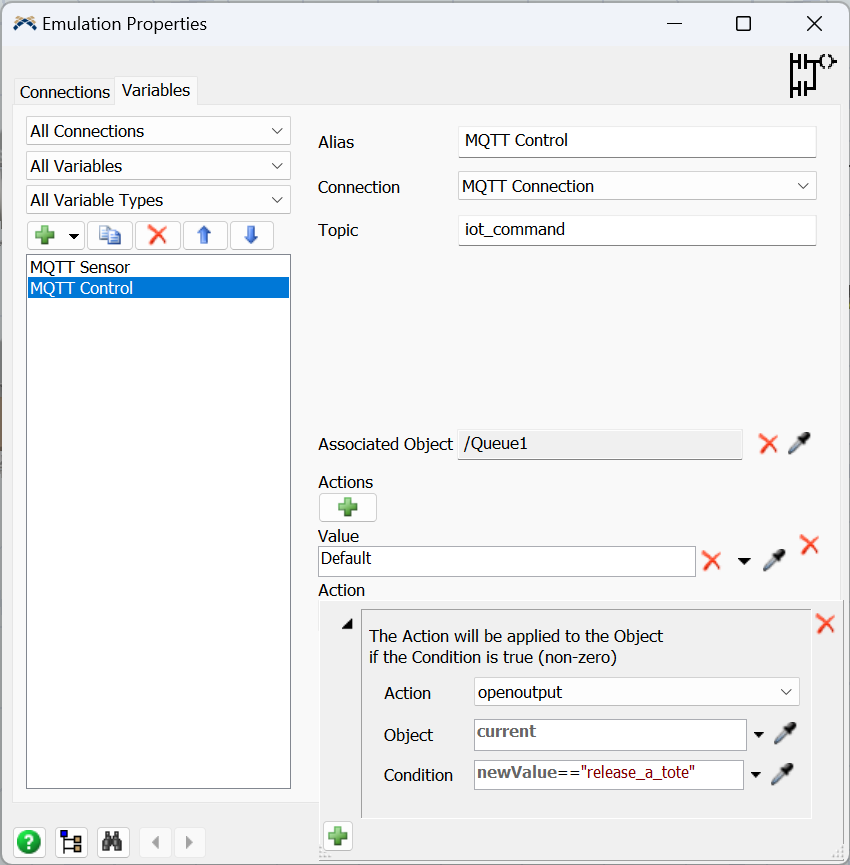 In our model we want that – when a box covers the photoeye – the "input" tag is set to 1 and when the "output" tag is set to 1 a tote is released from its queue.