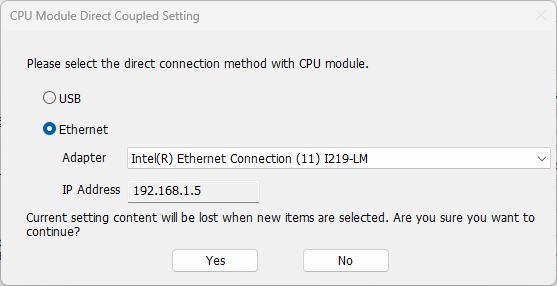 Press CPU Module Direct Coupled Setting button and select Ethernet interface to be used to reach the PLC: