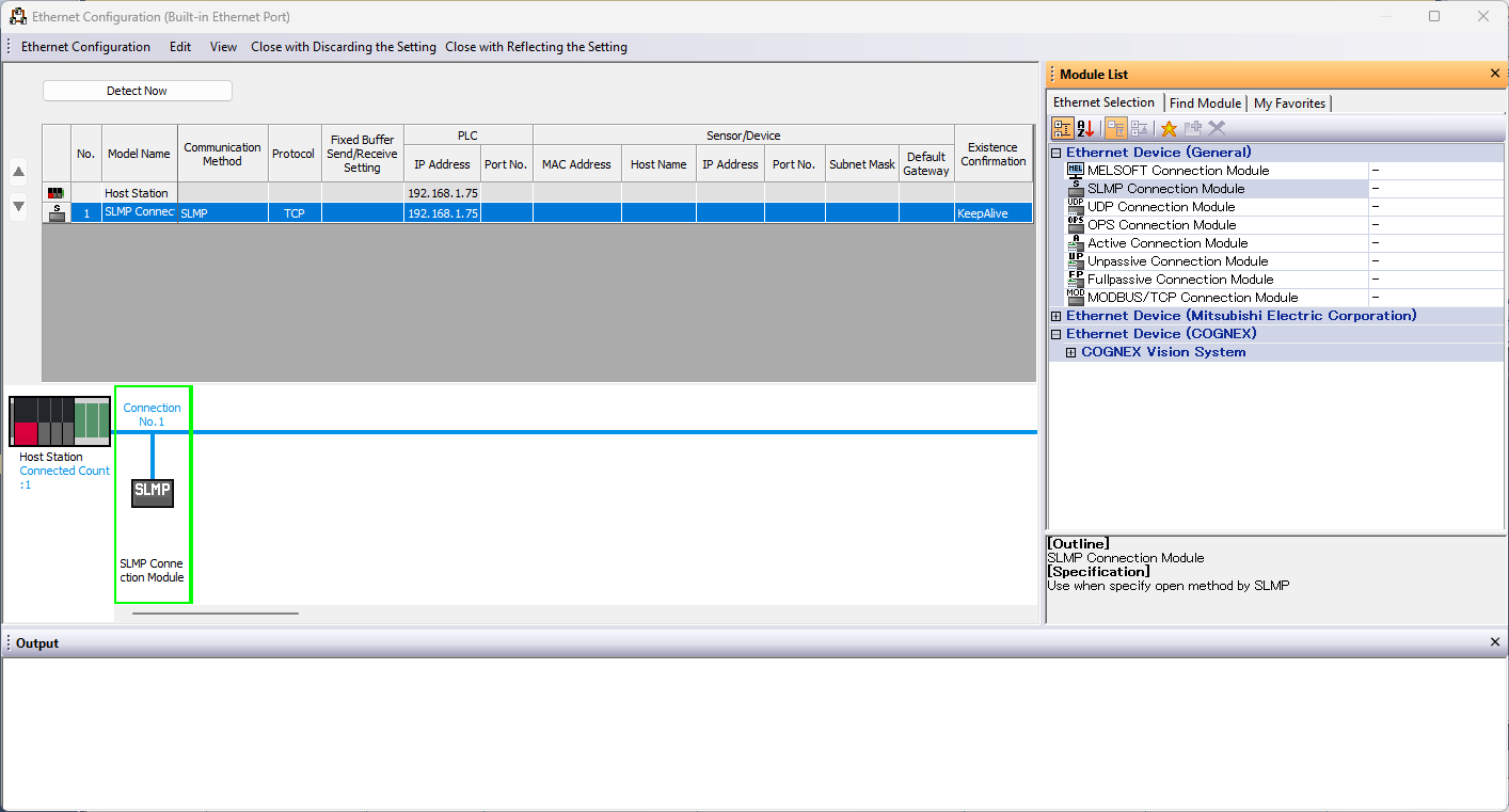 Expand the Ethernet Device (General) on the right and drag from the list a SLMP Connection Module on the blue line at the bottom: