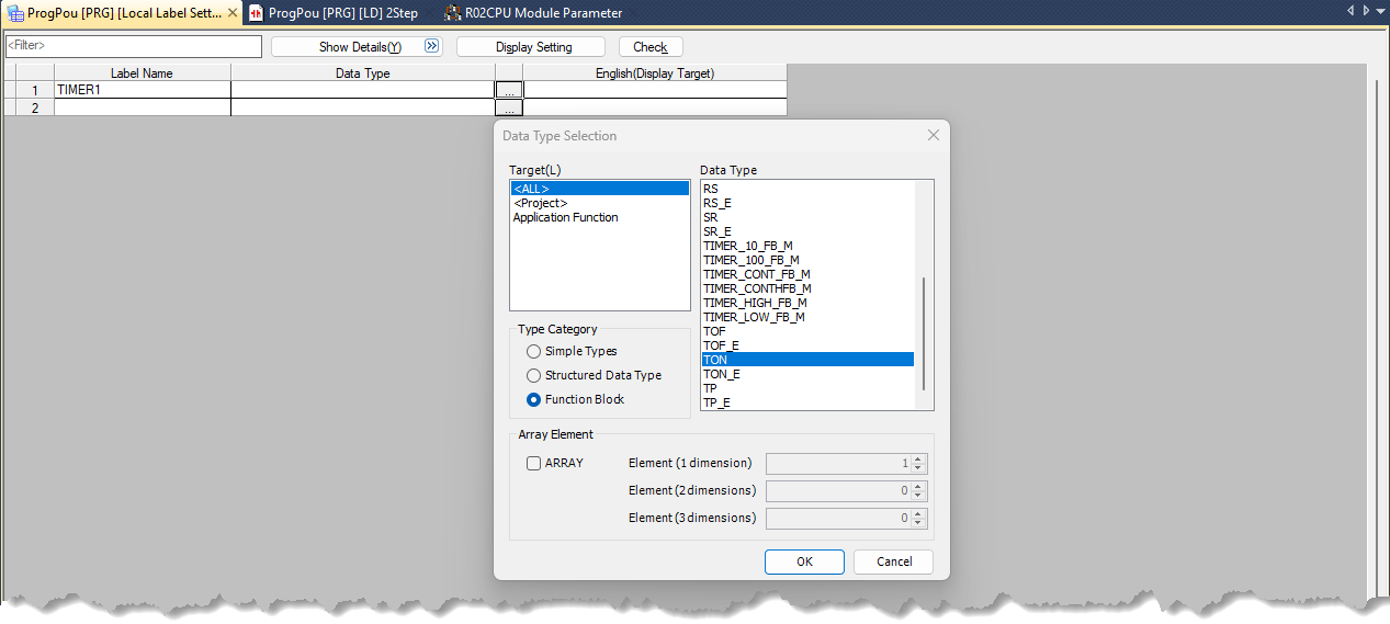 Then type TIMER1 into column Label Name of row 1, press the "…" ,select Function Block from the Type Category group and from the Data Type list select TON.