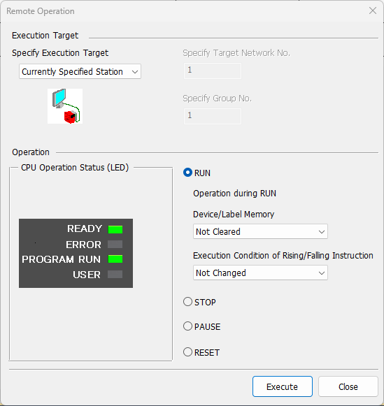 If Program Run led is not green select the RUN radio button and press Execute.