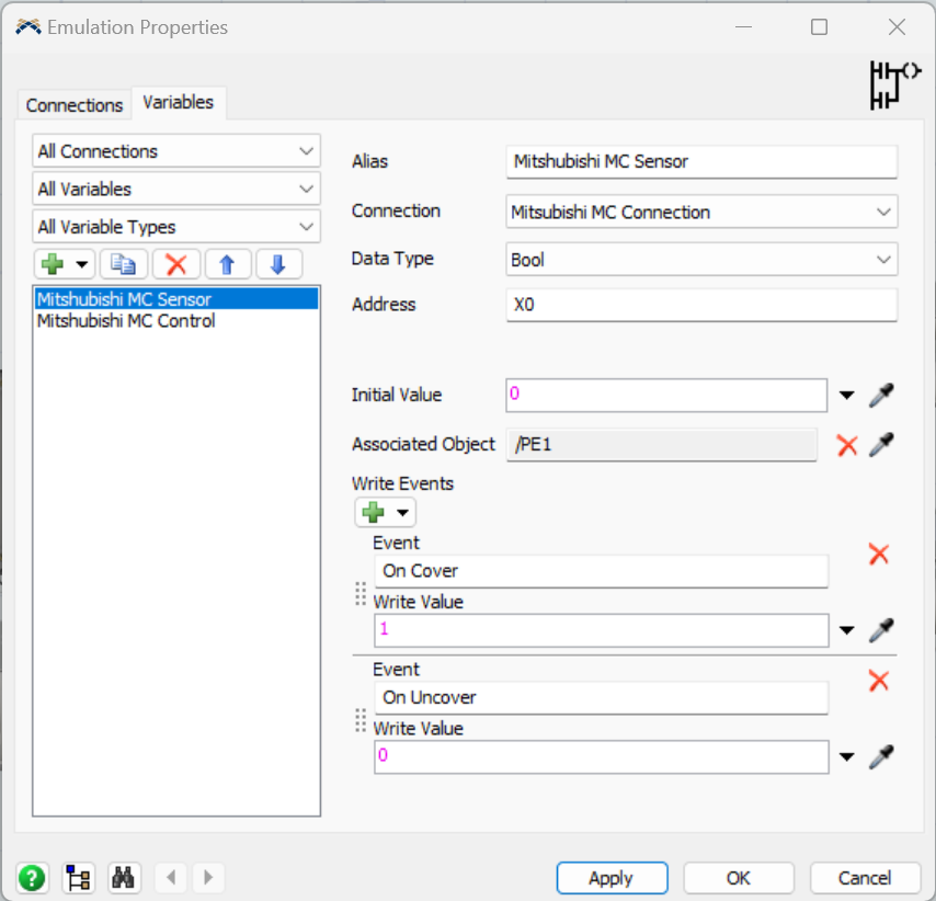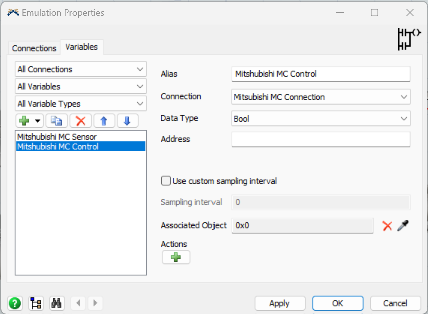 To do this, select the Mitsubishi MC Control, set the Data Type to Bool and set the Address to Y0.