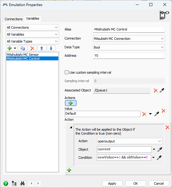 Then configure a new action and set the queue open its output when the PLC value turns from 0 (oldValue) to 1 (newValue):