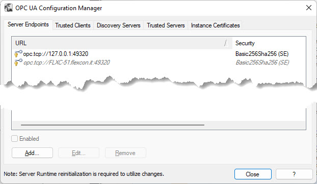 This will open the "OPC UA Configuration Manager" that allow to define the list of 'server endpoints', i.e how this server can be reached.