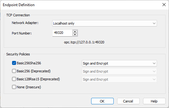 In the "End Point Url" enter the URL of the OPC UA Server's endpoint: for this tutorial is the string "opc.tcp://127.0.0.1:49320".