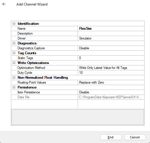 press "End" to create the communication channel an close the wizard.