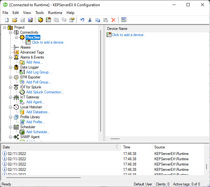 - Prepare a FlexSim model and connect it to the OPC UA server.