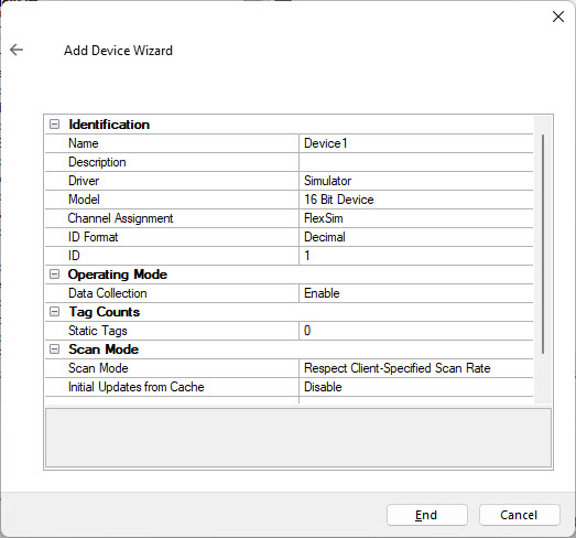 press "End" to create the device an close the wizard.