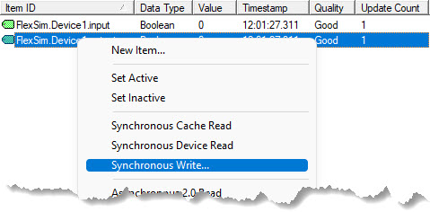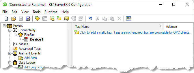 The client will open and select the "FlexSim.Device1" node on the left to show the current values of the tags: