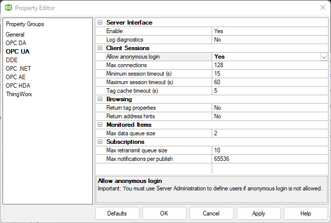 Select the "OPC UA" from the "Property Groups" and change "Allow anonymous login" to "Yes":