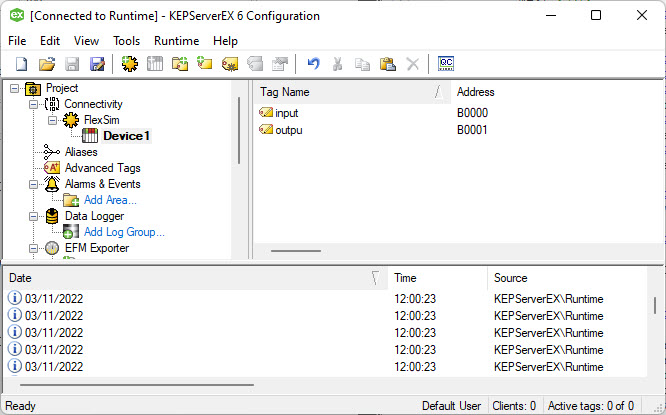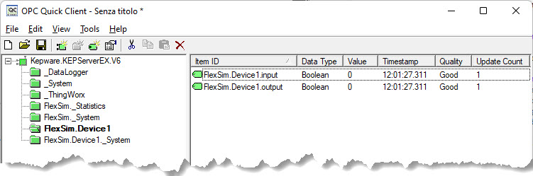Now the OPC UA server expose two tags that can be read/written by OPC UA clients, like FlexSim is.