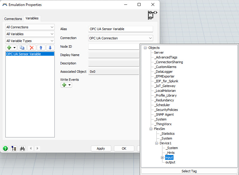 This will add a "OPC UA Sensor Variable" that will be bind to the "input" tag.
