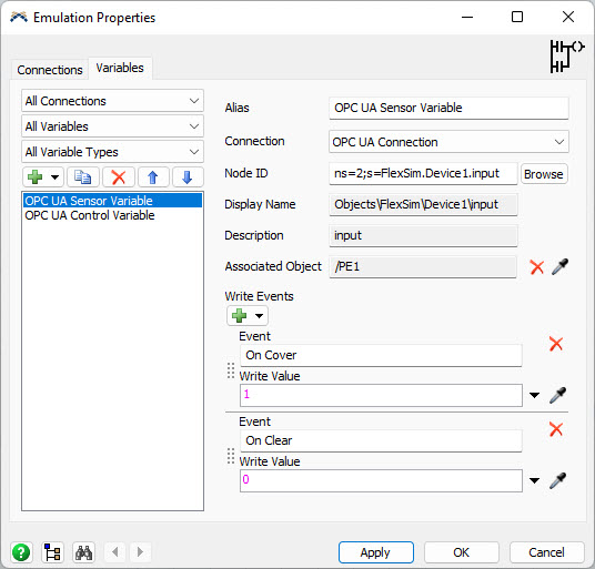 At this point the connection between FlexSim variables and OPC UA tags is established. It’s necessary to define how FlexSim models drives PLC input and how PLC’s output is managed by FlexSim as well.